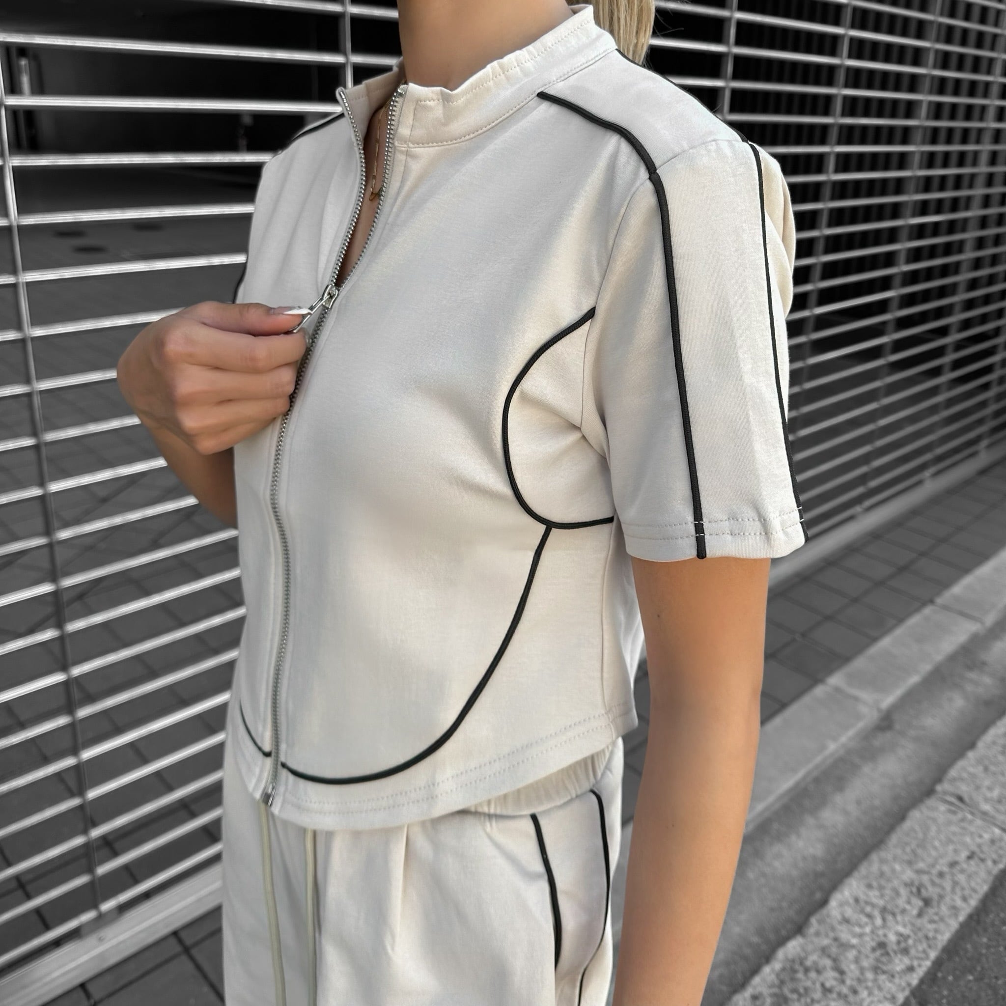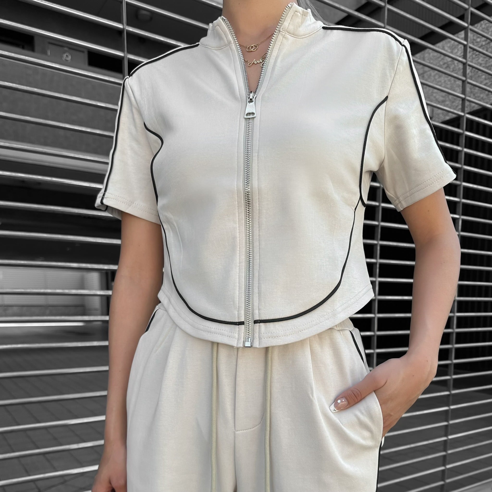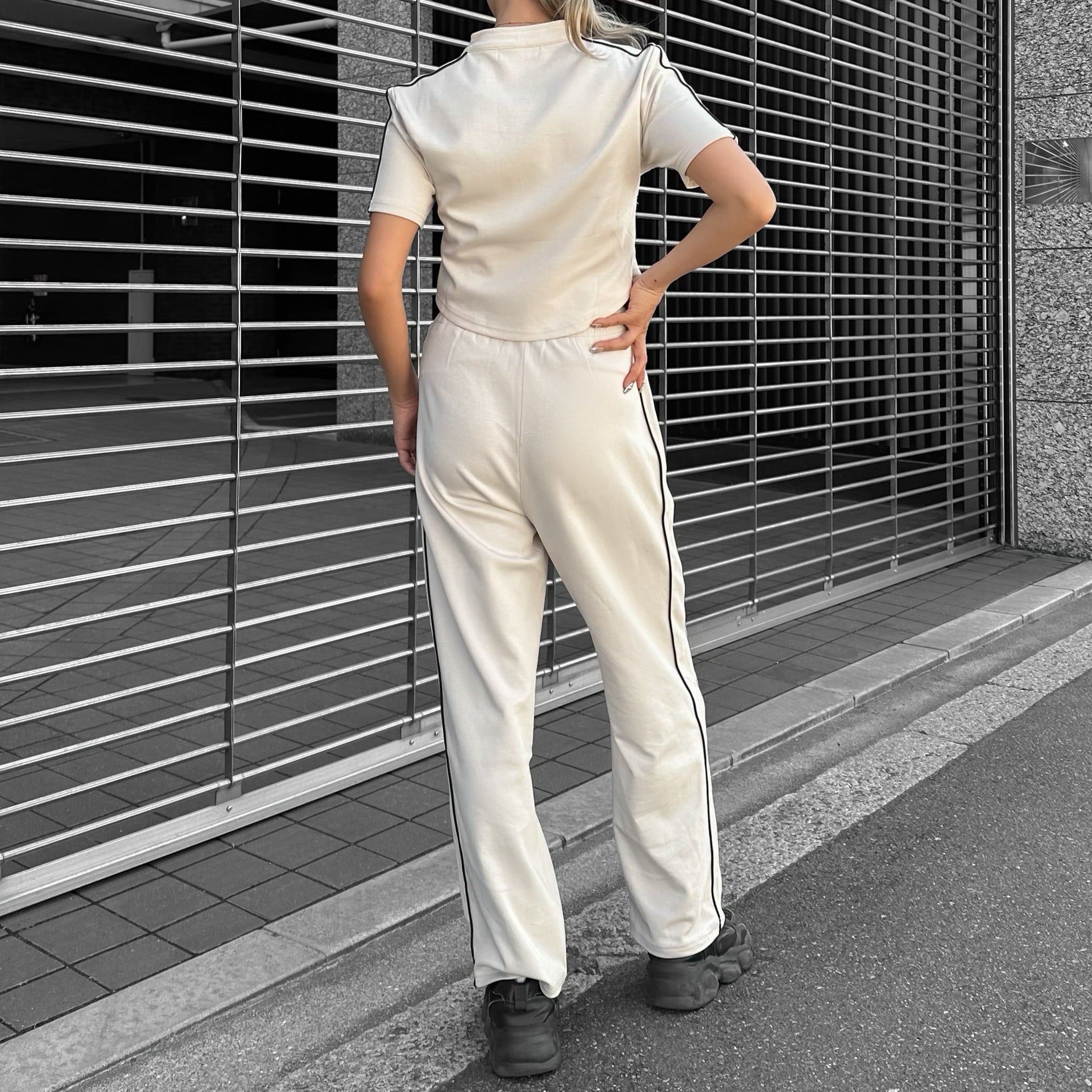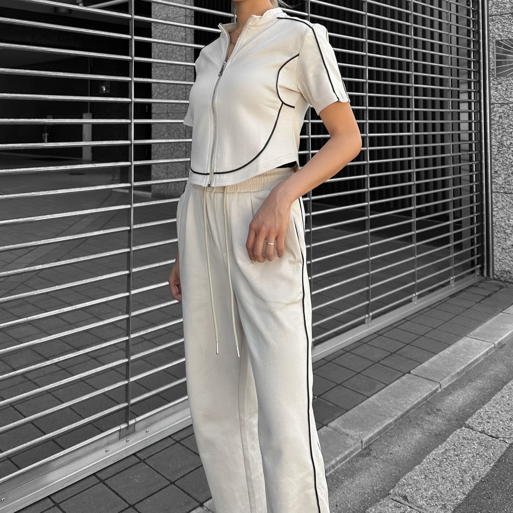 トップスがショート丈になっているので、
